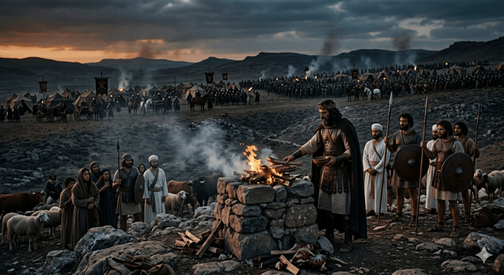 But Saul’s kingship slowly unraveled – not because he lacked military skill, but because his heart posture toward God was fundamentally self‑centered. In 1 Samuel 13, Saul sees his odds of success in battle against the Philistines slipping away while he awaits for the arrival of Israel’s spiritual leader, judge, and prophet Samuel to come and offer a sacrifice to God – seeking God’s favor and blessing upon the battle to come. Impatient and anxious, Saul instead seizes the spiritual mantle he was never meant to carry and offers sacrifices himself. This was no small sin, but a blasphemous overreach that grieved the heart of God. Saul doesn’t repent. At Samuel’s rebuke, he deflects and offers excuses to attempt at justifying his actions (13: 11-12).